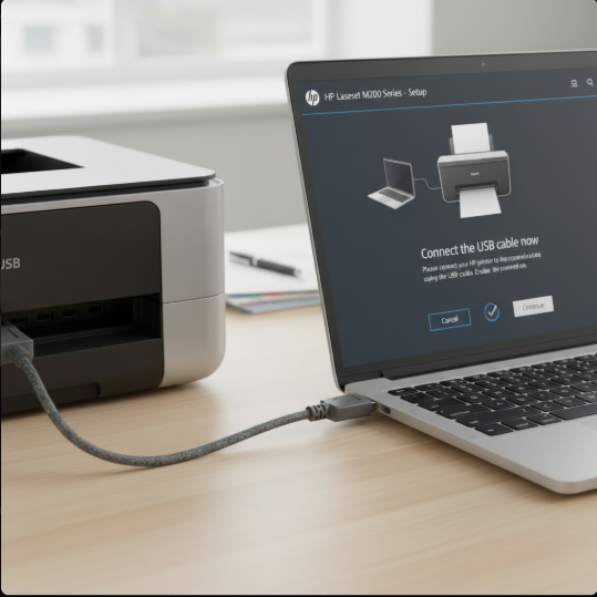 در یکی از مراحل نصب، نرمافزار از شما میخواهد که کابل USB را به پرینتر و لپتاپ وصل کنید. اکنون زمان مناسب برای اتصال کابل است. پس از اتصال، ویندوز به طور خودکار پرینتر را شناسایی کرده و نصب را ادامه میدهد.