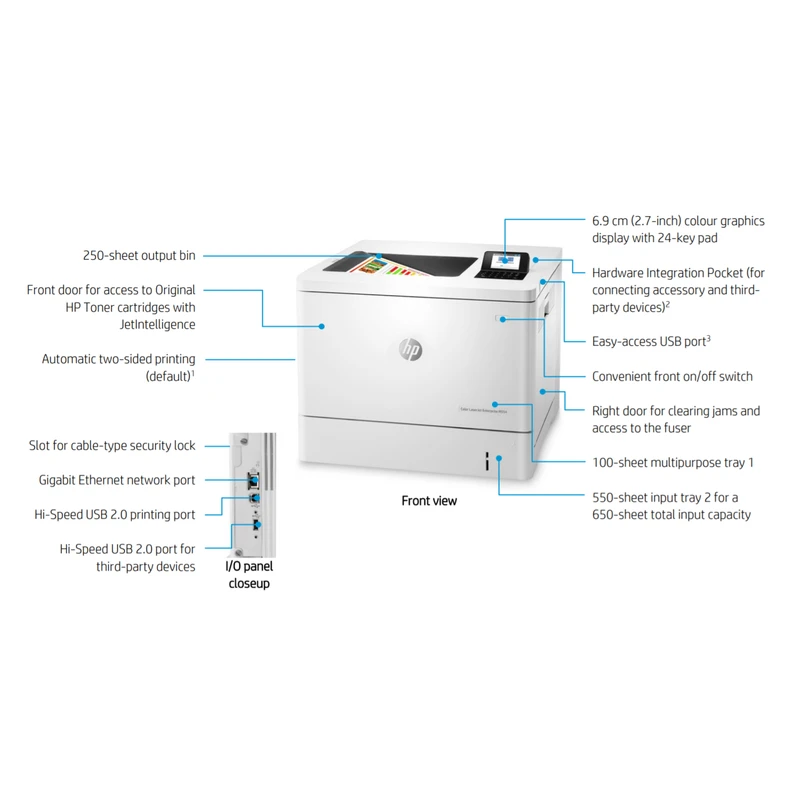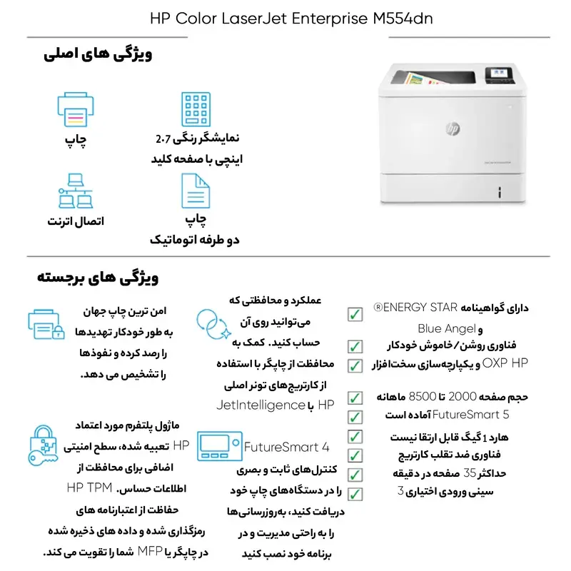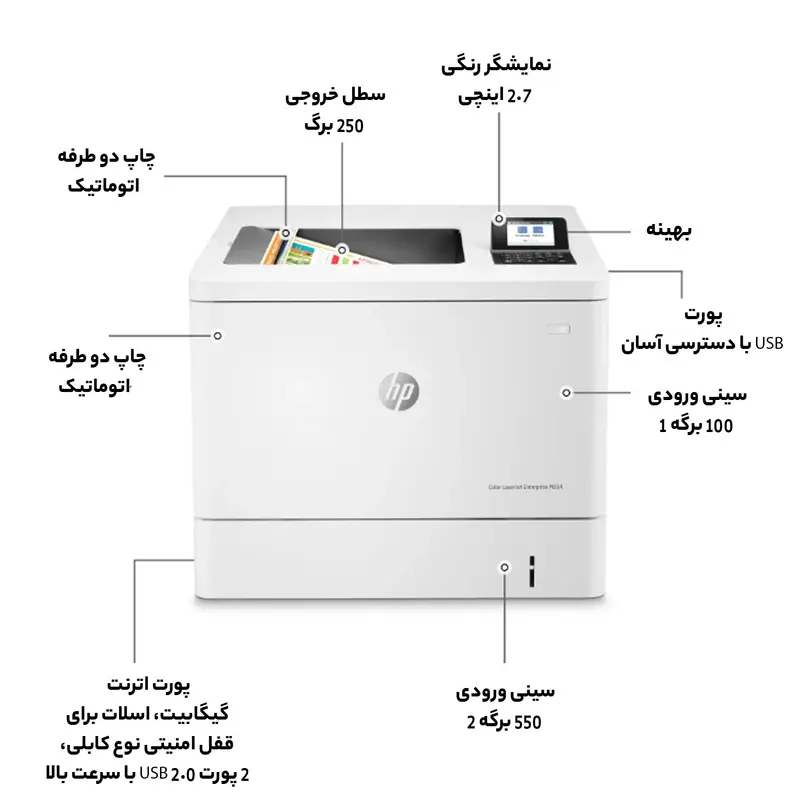 شرکت اچ پی پرینتر لیزری رنگی LaserJet Enterprise M554dn را به سینی 550 برگی، چاپ در ابعاد A4 و قابلیت چاپ دورو مجهز کرده و از این رو برای مصارف اداری و .. با حجم کاری زیاد گزینه مناسبی است. کیفیت چاپ این پرینتر 1200 × 1200 dpi است این رزولوشن با فناوری ImageREt به 3600dpi میرسد که کیفیت فوق العاده ای را برای شما به ارمغان می آورد و میتواند کاتالوگ و بروشورها را با کیفیت بالایی به چاپ برساند و در یک مقایسه کوتاه می توان گفت در مقایسه با هم رده هایش در سطح قابل قبولی قرار میگیرد؛ گفتنی است، قابلیت چاپ رنگی پرینترهای لیزری بههیچوجه با پرینترهای جوهرافشان قابلمقایسه نیست. این پرینتر رنگی به یک صفحهنمایش 4 خطی رنگی مجهز شده است که کاربری آسانی را رقمزده تا کاربر بتواند در کسری از ثانیه تنظیمات موردنظر خود را اعمال و به چاپ برساند.