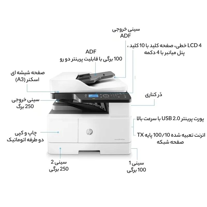 پرینتر HP LaserJet MFP M443dna یک دستگاه چندکاره قدرتمند با قابلیتهای متنوع و کیفیت چاپ بالا است که برای محیطهای کاری با حجم کاری زیاد و نیاز به چاپ اسناد با کیفیت مناسب است.