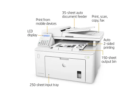 پرینتر HP LaserJet Pro MFP M227fdn یک دستگاه چندکاره لیزری سیاهوسفید است که برای محیطهای کاری کوچک و متوسط طراحی شده.